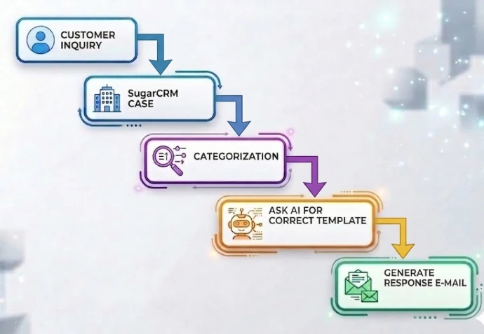 Unser Kunde verwendet SugarCRM für die Abwicklung seiner Service Prozesse. Die Bearbeitung von Support-Tickets erfolgt über das Cases-Modul. Wenn eine Kundenbeschwerde, eine technische Anfrage oder eine Kooperationsanfrage über die Webseite des Kunden eingeht, wird diese automatisch als Case im System erfasst. Die Herausforderung liegt in der Menge und Vielfalt der eingehenden Anfragen: Hunderte Antwortvorlagen sind in Form von strukturierten Knowledge-Base-Artikeln hinterlegt und Service Mitarbeiter müssen daraus die jeweils passende auswählen.