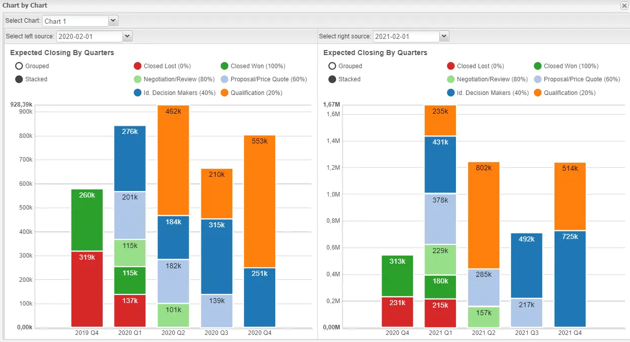 - Pipeline gruppiert nach Quartalen / Salesstage (stacked Bar Chart)