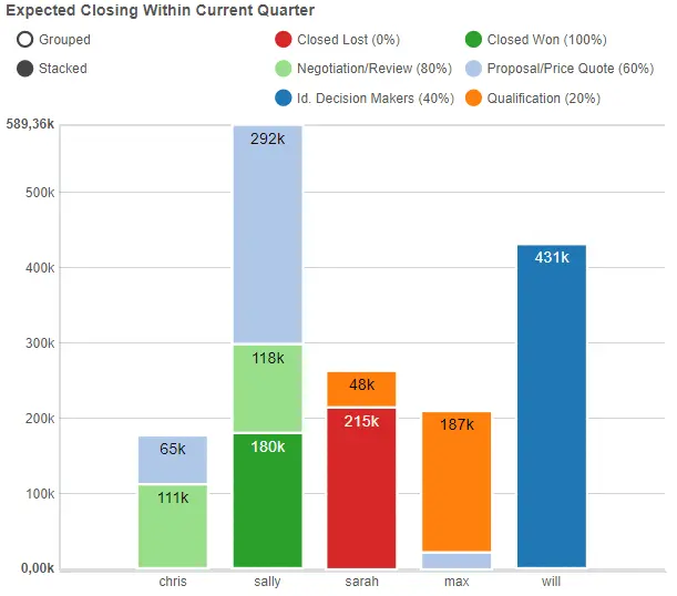 d) Im Chart Salespipeline Auswertung nach Mitarbeiter für das bestehende Quartal. In dem grafischen Chart sieht man für jeden Account Manager sehr gut die akkumulierten Beträge seiner Verkaufschancen pro Phase. Damit lässt sich die Gesundheit der Pipeline bewerten um die Auslastung der Mitarbeiter entsprechend zu planen.