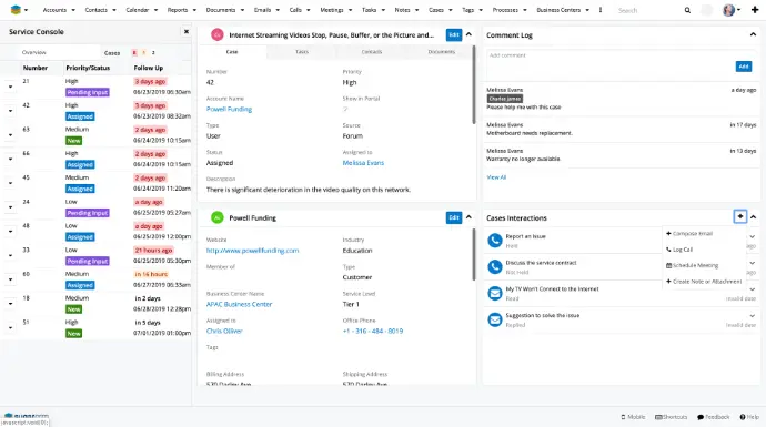 - Die Servicekonsole ist eine Schlüsselfunktion von Sugar Serve. Sie platziert wichtige Datenpunkte wie die nächstbeste Aktion basierend auf den SLA, Konto- und Kontaktinformationen, dem Kontoaktivitätsverlauf und sogar Falldetails in den Mittelpunkt – ohne Suchen oder Navigieren. Weitere Funktionen sind: